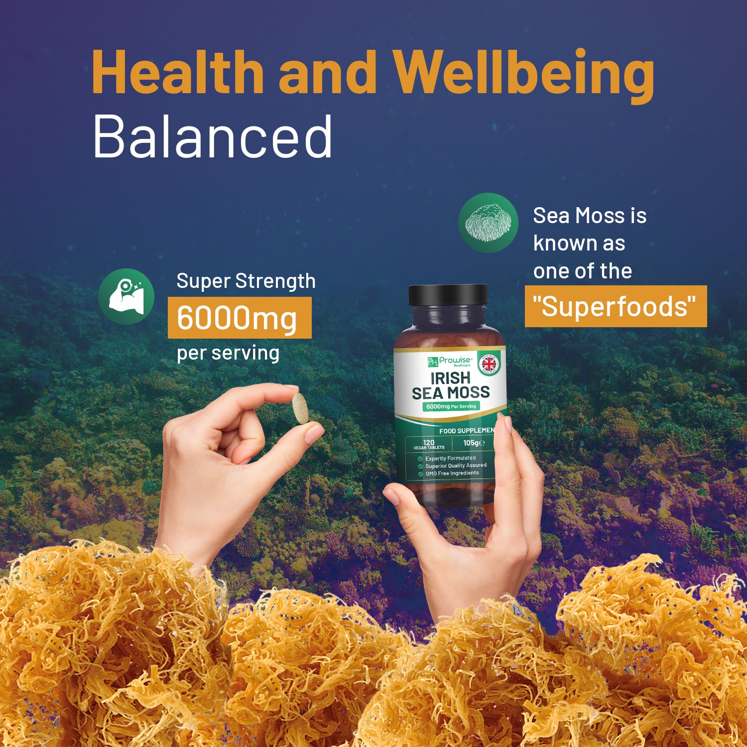 Irish Sea Moss Tablets High Strength 6000mg – Irish Sea Moss Supplement 120 Vegan Tablets High Potency - UK Made - Non-GMO by Prowise
