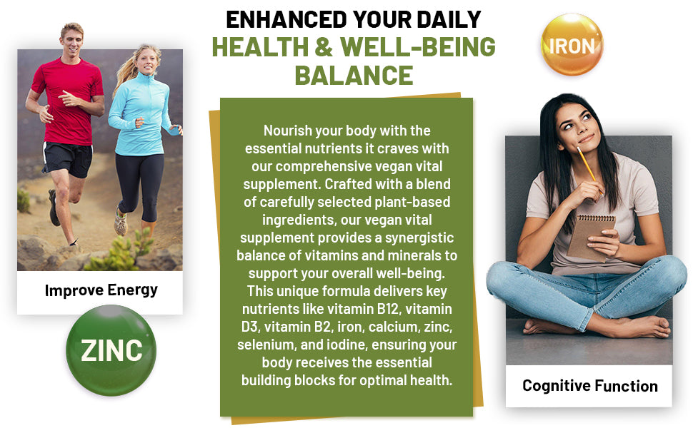 A COMPLETE MULTIVITAMIN & MINERAL SUPPLEMENT: Our Vegan Vital multivitamins and minerals complex offers a combination of 8 essential vitamins, minerals & trace elements: including Vitamin B2, B12 & D3, Calcium, Iron, Zinc, Selenium & iodine. Each ingredient is carefully dosed and has specific functions. Vitamin D contributes to the normal function of the immune system, while B vitamins contribute to the reduction of fatigue.